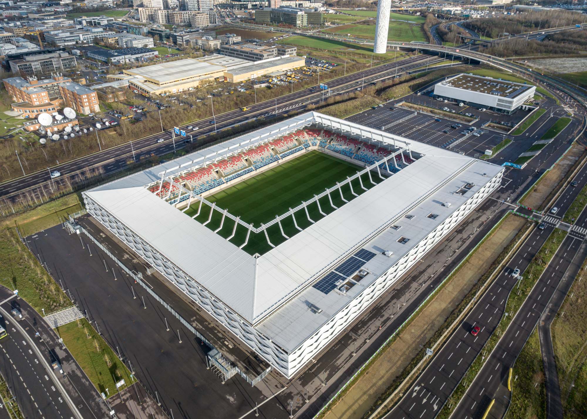 Le Stade National du Luxembourg, situé à la frontière sud de la capitale luxembourgeoise dans le quartier florissant de la Cloche d’Or, incarne un mariage harmonieux entre design innovant, fonctionnalité exceptionnelle et accessibilité stratégique. Le stade peut accueillir 9471 spectateurs et le terrain de jeu est adapté au football et au rugby.