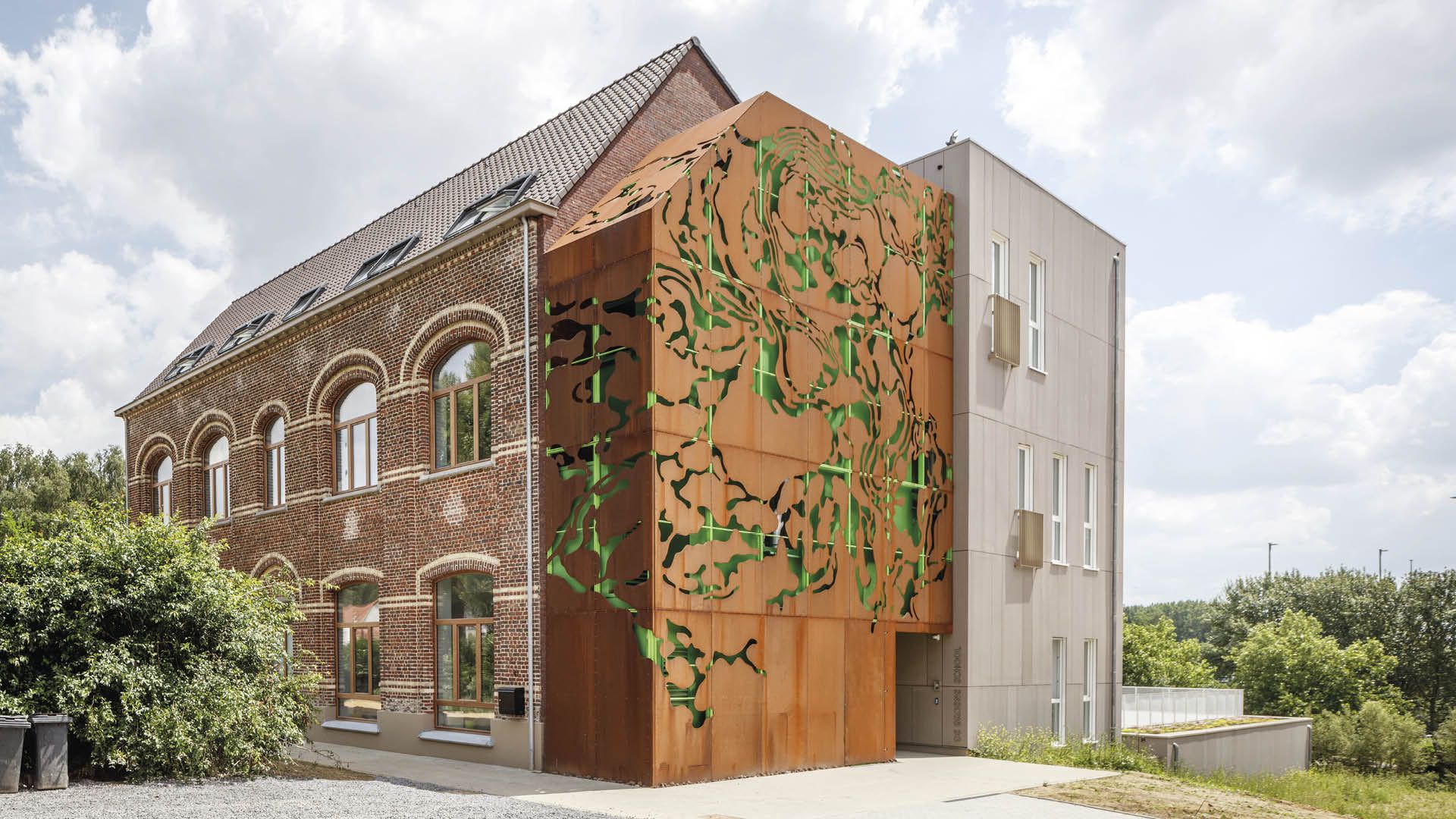 À la base de cette œuvre d’art, qui s’étend comme une toile sur la façade d’une école, se trouve une série de sculptures ‘blob’ numériques : des formes organiques générées par ordinateur qui remettent en question la rigidité et l’immobilité de la construction architecturale. Cette tension entre les ‘blobs’ et leurs ‘boîtes’ (‘boxes’) est une constante dans l’œuvre de l’artiste. De cette façon se crée un dessin qui évoque une structure de lierre qui de façon organique semble ‘pousser’ sur le bâtiment pour l’envelopper. L’artiste a voulu rendre la façade plus attrayante, afin d’attiser la curiosité des passants, susceptibles de se demander ce que pourrait bien révéler l’intérieur du bâtiment. L’œuvre a été montée sur la façade de la cage d’escalier, déjà recouverte par un crépi vert et pourvue de points de fixation. Les pièces de tôle en acier auto-patinable (‘corten’), en grande partie prémontées, y ont été vissées. La construction a été dotée d’un éclairage LED qui met l’œuvre en valeur.