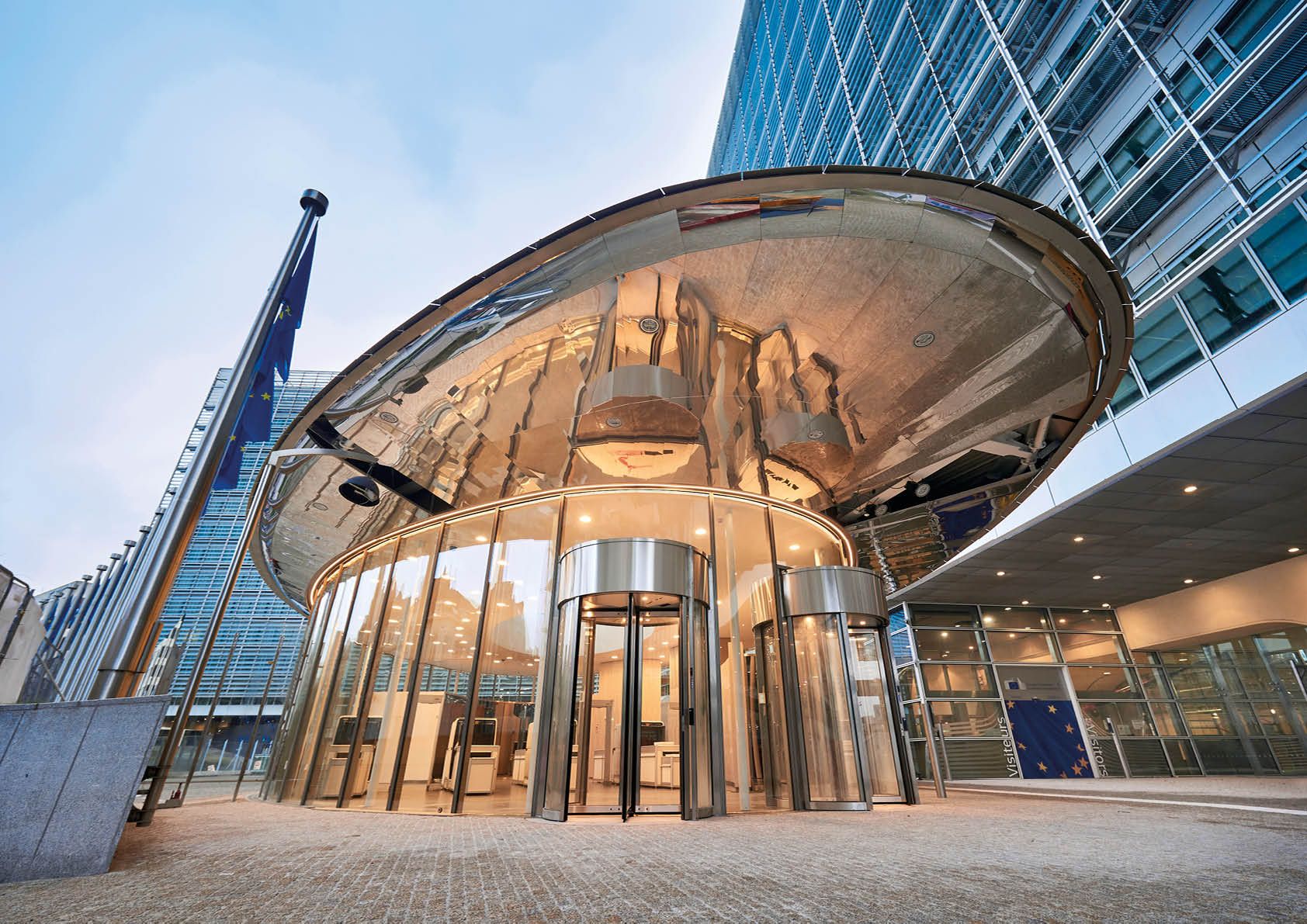 Pour la Commission européenne à Bruxelles, un pavillon elliptique a été construit au pied du Berlaymont, pour accueillir les visiteurs et mieux sécuriser le site