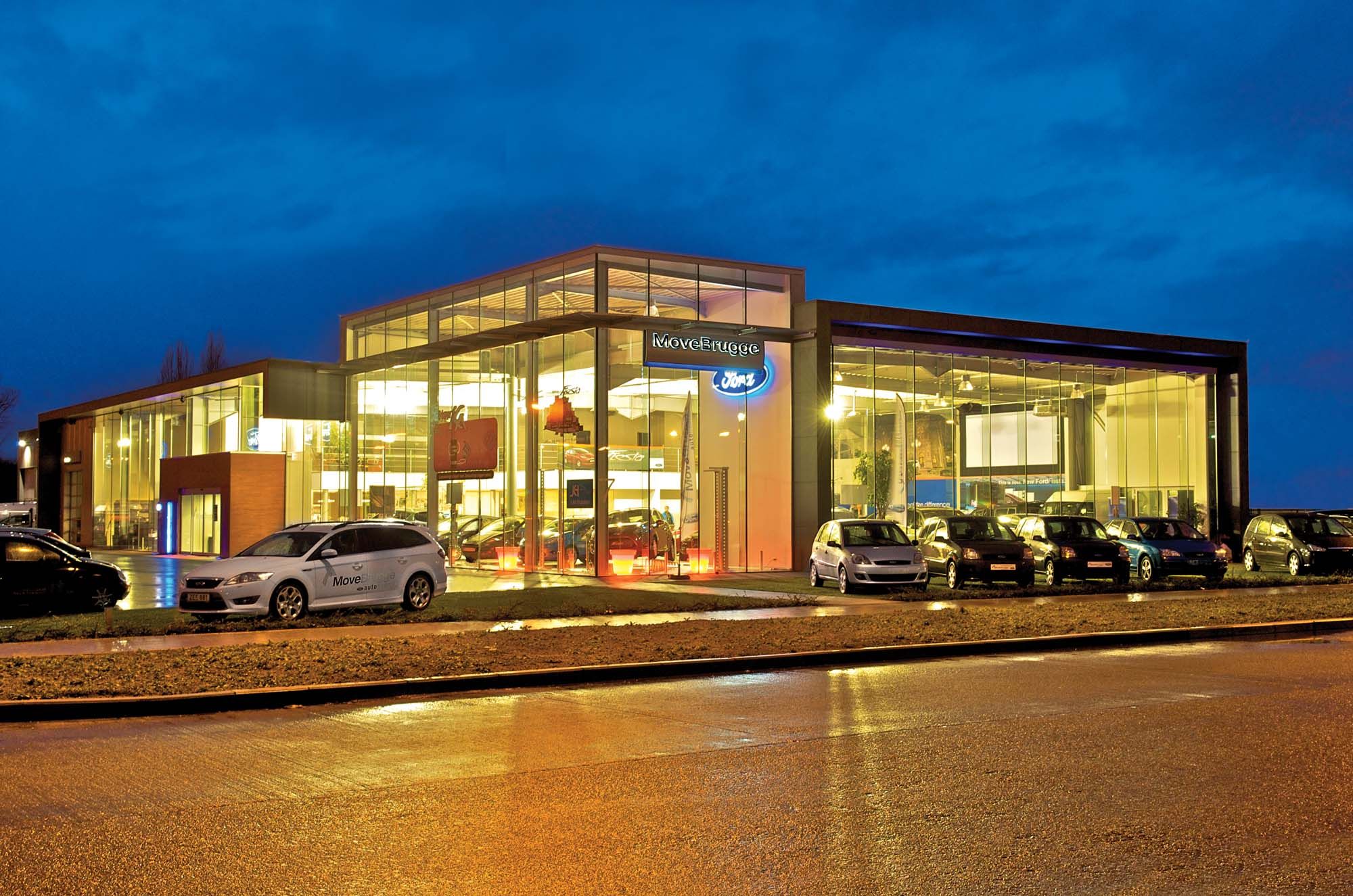 Ce temple de l’automobile, situé sur un parking de l’ancien site Philips à Bruges, comprend un hall d’exposition, un atelier et des bureaux. Grâce à son architecture contemporaine, sobre et élancée, cette boîte transparente se distingue des autres réalisations du secteur. C’est avec le souci de construire un bâtiment ouvert et léger que les concepteurs ont délibérément opté pour une construction en acier.