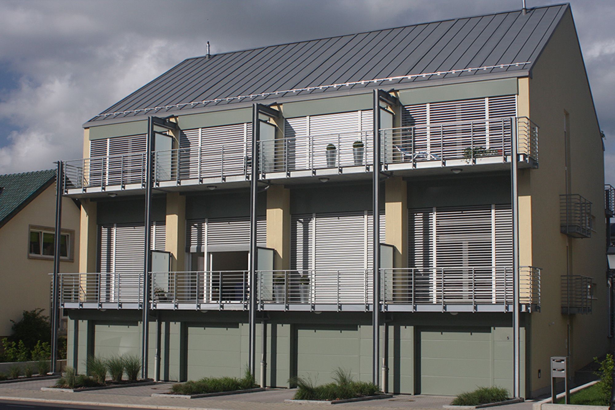 Ce projet de 4 unités de logements réparties en 2 immeubles bi-familiaux combine les avantages de l’immeuble à appartements et de la maison mitoyenne de manière à offrir aux occupants un maximum d’espace et d’intimité dans un volume compact. Celui-ci est agrémenté de grandes terrasses reposant sur une structure métallique en acier galvanisé à chaud. Les profilés verticaux, dans l’alignement des mitoyens, supportent les cadres de terrasses. Dans ces cadres sont placées des prédalles formant le coffrage perdu de la dalle de la terrasse. Le choix de l’acier pour la structure s’est imposé pour sa facilité de mise en oeuvre et sa légèreté, en opposition au volume compact de l’édifice et afin de ne pas entraver l’apport de lumière dans le bâtiment.