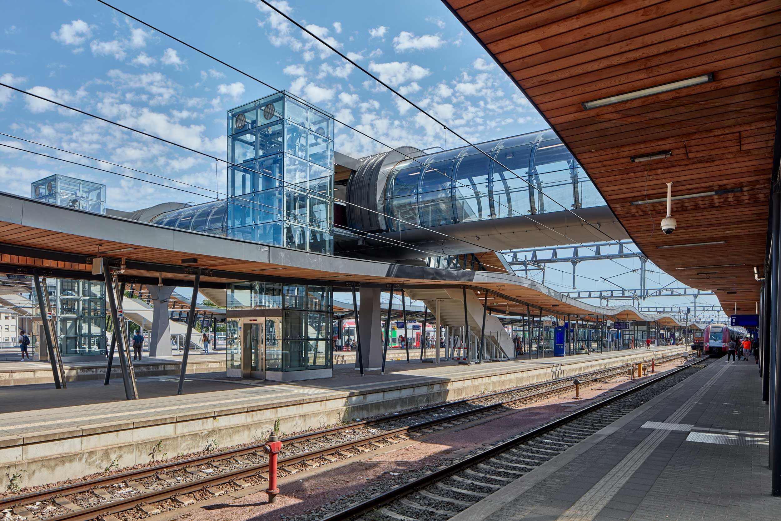 Fin de l’année passée, une toute nouvelle passerelle piétonne a été mise en service à la gare de Luxembourg-ville en lieu et place d’un ouvrage provisoire. Ce renouvellement, réalisé dans le cadre du projet d’extension et de modernisation de la gare, a pour but de moderniser la structure et aussi d’offrir un accès sans barrières à tous les usagers. Piétons, cyclistes et personnes à mobilité réduite peuvent y circuler pour rejoindre Bonnevoie depuis le quartier de la gare, en enjambant les six quais et les dix voies ferrées.