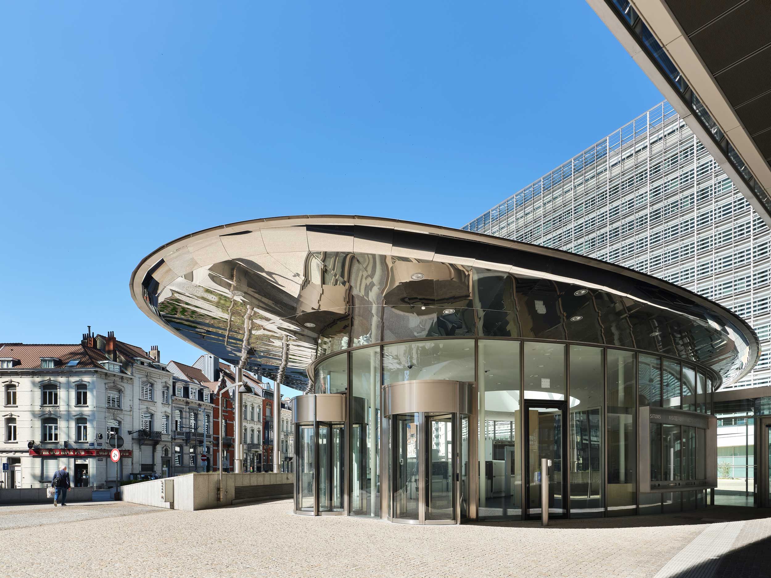 Pour la Commission européenne à Bruxelles a été construit au pied du Berlaymont un pavillon elliptique destiné à l’accueil des visiteurs, dans une optique de sécurisation des lieux. Modeste par rapport à son imposant voisin auquel il donne accès, ce bâtiment n’en a pas moins donné du fil à retordre à ses concepteurs et constructeurs.