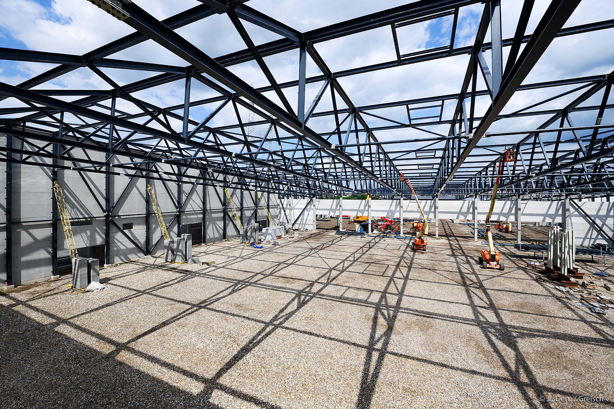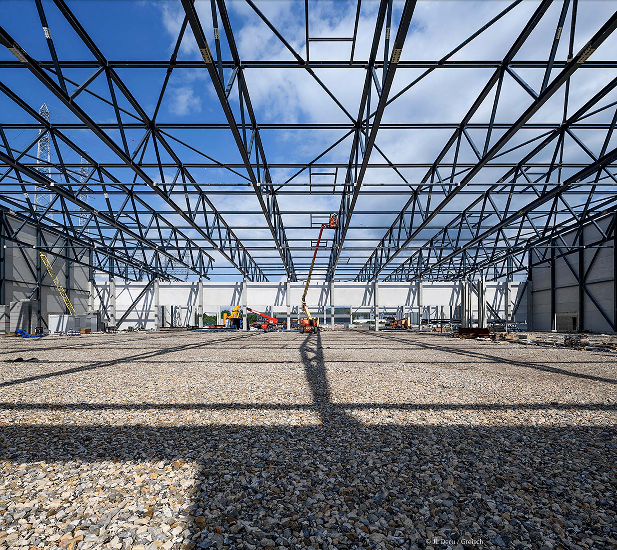 Les structures de toiture des halles principales sont composées de poutres treillis de hauteur 5.0 m entre-distantes de 8,1 m composées de mailles type Warren de 6 m. Ces structures sont hyperstatiques longitudinalement : 69 m de portée dans la halle 1 (surface utile de 5600 m² libre de colonnes) suivie de 42 m de portée dans la halle 2 (surface utile de 3400 m² libre de colonnes) puis 12 m en porte-à-faux à l’extérieur dans la zone logistique. Les toitures des 3 autres halles d’exposition et du restaurant sont à pentes et à niveaux multiples. Ces structures suivent la géométrie des toitures sans appuis intermédiaires avec des portées fréquentes de 24 m.
