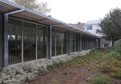 Tekst: <p>Op een langgerekt perceel vlakbij het Sint-Pietersstation van Gent werd een nieuwe woning met kantoor opgetrokken. De wens om te werken in het groen was het uitgangspunt voor het project. De woning bevindt zich bijgevolg aan de straatzijde en is opgebouwd met dragende metselwerkwanden. Via een hoge doorgang bereikt men de ingang van het kantoor, dat zich in de lengte uitstrekt in de tuin. Het kantoorgebouw is opgebouwd als een modulaire staalstructuur, die verwijst naar een pergola of een park arcade. Het staalskelet zit aan de buitenzijde en is losgemaakt van de wanden, wat onder andere voordelen biedt op het vlak van brandveiligheid. De wisselwerking met de tuin was een belangrijk aspect van het ontwerp. Het kantoor is dan ook sterk beglaasd, maar overal voorzien van luifels om oververhitting tegen te gaan. De binnenin gelegen ruimtes krijgen daglicht via een grote lichtkoepel in het dak.</p>