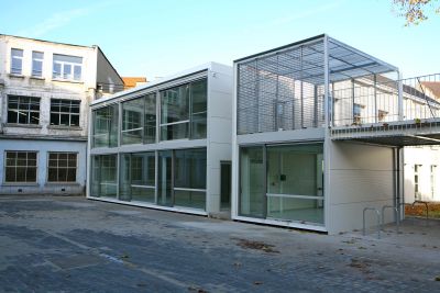 Tekst: <p>La commune de Molenbeek a pris l’initiative de réhabiliter d'anciens bâtiments en ateliers d’artistes et en bibliothèque. Le bâtiment existant accueillera des ateliers d’artistes et une bibliothèque. Un second bâtiment existant sera transformé en halle extérieure, seule la façade en brique d’origine est conservée. L'ajout d’un troisième bâtiment offre des locaux complémentaires. L’emploi de la structure métallique est décliné de quatre manières différentes et répond aux nécessités propres à chaque bâtiment : une structure en acier pour l’ossature du nouveau bâtiment, une charpente acier en remplacement pour le bâtiment existant, un portique métallique pour le renforcement de la stabilité de la halle couverte. C’est également d’acier que sont constitués les habillages des escaliers et des gardes corps de même que les murs mitoyens. L’intervention architecturale se décline ainsi en trois lieux différents et chacune à son échelle. Les finitions en acier, qu’il soit laqué, galvanisé, industrialisé affinent la réalisation, conférant au projet une homogénéité d’ensemble.</p>