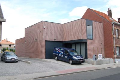 Tekst: <p>Na jarenlang het ouderlijke huis als uitvalsbasis voor de beroepsactiviteit gebruikt te hebben, zag installateur van sanitair en verwarming De Mars zich genoodzaakt tot afbraak en nieuwbouw. Op het kleine terrein werd een nieuwe opslagruimte met kantoor opgetrokken. De keuze voor een staalskelet lag voor de hand omwille van de snelle plaatsing, de flexibiliteit en een vrije open indeling van de ruimte. De staalstructuur bestaat uit HEA- en IPE-staalprofielen en werd integraal uitgevoerd met een brandwerende coating en eindlaag. Het dak is samengesteld uit trapeziumvormige geperforeerde staalplaten met interne witte coating. Deze structuur werd bekleed met prefabbetonnen sandwichpanelen met baksteenmotief. Het kantoorgedeelte bevindt zich aan de straatzijde, de opslagruimte aan de achterkant. Deze laatste krijgt daglicht via een raampartij bovenaan in de achtergevel. Een kleine overkraging in de zijgevel biedt beschutting aan de inkom en bevat ook de zonwering voor het kantoor.</p>