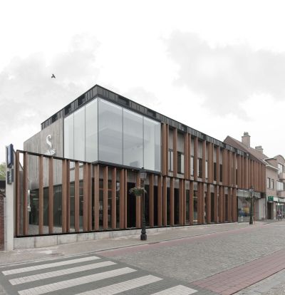 Tekst: <p>Kantoor Solvas is een nieuw kantoorgebouw in het centrum van Zomergem dat twee niveaus kantoren en één niveau appartementen omvat. De kantoorniveaus zijn in de gevellengte verschoven ten opzichte van elkaar. Dit creëert een grillig effect, dat nog extra benadrukt wordt door de aanwezigheid van twee glazen volumes en een ritmering van houten lamellen. Het appartementsniveau onderscheidt zich door een zinken gevelafwerking. Binnenin wordt de zee van open ruimte subtiel benadrukt door een raster van zwarte stalen kolommen. Deze werden samengesteld uit standaard kokerprofielen en verstevigd met twee flankerende flenzen van platstaal, zodat de kolommen - zonder in te boeten aan slankheid en verfijning - een doorsnede met een grotere draagkracht krijgen. Staal komt ook elders in het gebouw terug, bijvoorbeeld in de horizontale en verticale stalen liggers die de grote glaspartijen ondersteunen, de trap en de aanpalende stalen draagconstructie voor de glazen vloer tussen de twee kantoorniveaus. </p>