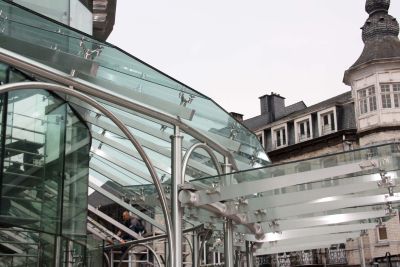 Tekst: <p>Le «Pouhon Piere le Grand» est la plus connue des sources de Spa et de sa région. Le Pavillon de la Source, de plan octogonal, est prolongé d’un Jardin d’Hiver rectangulaire. Outre les stucs et staffs intérieurs, les menuiseries originales, la reconstitution des mosaïques de sol ou la reconstitution de divers éléments décoratifs, la restauration a porté sur la mise en valeur d’une charpente remarquable. Le projet comprend aussi la reconstitution de la rotonde vitrée détruite en 1948, ainsi que du déambulatoire vitré qui le prolongeait. Sachant qu’il ne subsistait aucun élément original susceptible d’être réutilisé ou même recopié, l’auteur de projet a opté pour une composition contemporaine. Constituées de volumes de vitrage de grandes dimension posés «à facettes», la paroi verticale en forme de demi-cylindre s’appuie sur une structure en tubes d’acier inoxydable. La toiture vitrée repose sur une sablière en tube d’acier inox laquelle s’appuie sur des colonnes du même matériau. Les colonnes sont reliées entre elles par des arcs en plein cintre.</p>