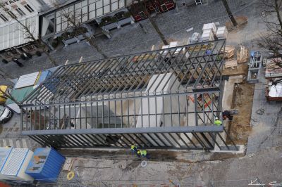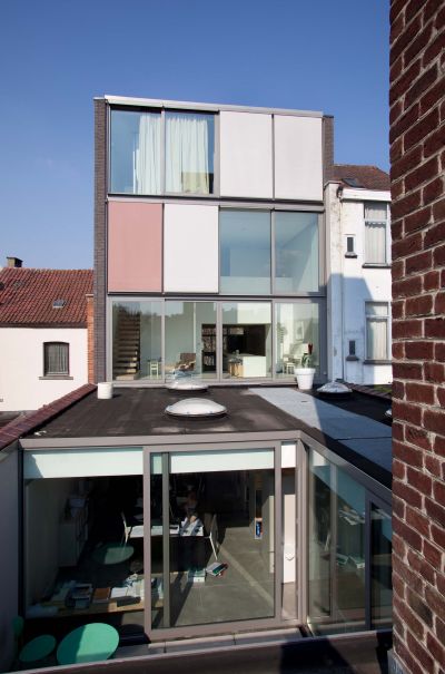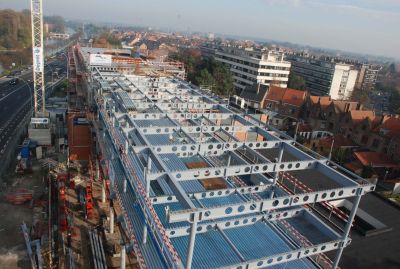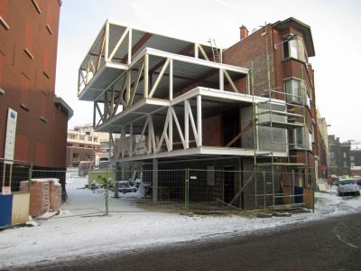 Tekst: <p>In het hart van Sint-Jans-Molenbeek werd een oude industriële site omgetoverd tot een open ruimte met een park en een nieuw appartementencomplex. De basisstructuur van het nieuwe pand, dat plaats biedt aan drie sociale appartementen, bestaat uit een staalskelet met staalbetonvloeren. Het skelet (28 ton staal) is opgevat als een stapelbouw met HEB140- en IEPE270-profielen (staalklasse S 235 JO) en enkele HEB200-liggers. Het werd bekleed met brandwerende verf. Het gebouw zelf heeft een getrapte constructie met twee zijdelingse uitkragingen van telkens 1,5 meter, die worden opgevangen door summiere spantwerkingen. De aanwezigheid van deze uitkragingen en de vraag naar een structuur die de architectuur zo min mogelijk zou hinderen, maakte de keuze voor staal evident. </p>