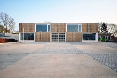 Tekst: <p>Een voormalige disco langs de Molsesteenweg in Geel, heringericht als commercieel pand, werd volledig gestript en uitgebreid met kantoren, inkom en magazijn. Dit nieuwe programma moest volledig in een extra strook passen, in een balkvormig volume dat voor de voorgevel geplaatst werd. De nieuwe voorgevel wordt opgevat als reclame, als blikvanger. Verticale houten planken op een horizontale bardage leveren een Moiré-effect op, dat de aandacht van de passant moet trekken. De raamomlijstingen bestaan uit witgelakt staal.<br>
