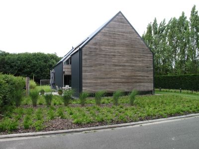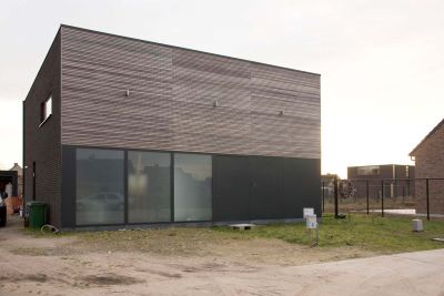 Een slank staalskelet met HEB100-kolommen en IPE200-liggers vormt de dragende structuur. De gevelbekleding in zwarte gegolfde profielplaten, met accenten in padoek beplanking, geeft het geheel toch een monoliet karakter. De verdiepingsvloer wordt grotendeels opgehangen aan de dakliggers, met een uitgestrekte leefruimte als resultaat. Koele materialen zoals de galva-steeldeckplaten, een zwart gepolierde betonvloer, een stalen trap en een glazen loopvloer worden ruimschoots gecompenseerd door de parketvloer op de verdieping en het buitenschrijnwerk in padoek. </p>