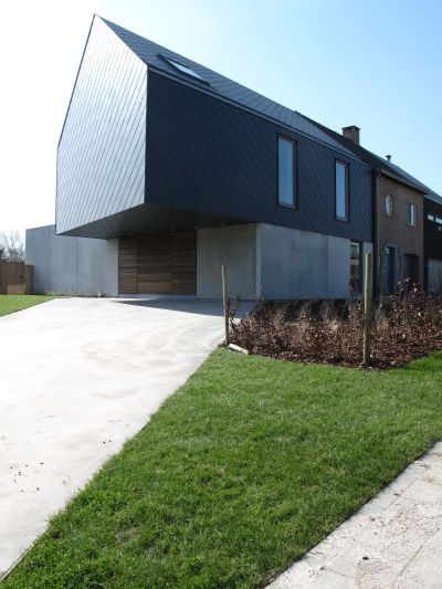 Op een sokkel in gladde betonnen sandwichpanelen wordt een monoliet volume geplaatst, uitkragend boven de oprit. Dit volume met galva-steeldeckplaten en binnendozen wordt volledig bekleed met vezelcement ruitleien. De verschillende bouwlagen zijn verbonden door trappen in gepoederlakte staalplaat. <br>