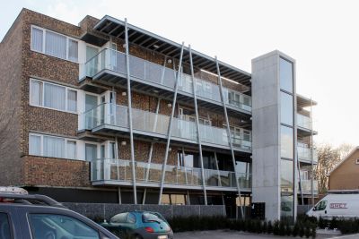 Tekst: <p>De Gewestelijke Maatschappij voor Woningbouw Zele is een sociale bouwmaatschappij die actief is in en rond Zele. Ze is al jaren gevestigd op het gelijkvloers van een appartementsgebouw. Boven de kantoren bevonden zich nog drie niveaus met telkens vier appartementen. Aangezien de kantoren door de groei van de maatschappij te klein waren geworden en ze toch op dezelfde vertrouwde locatie wilde blijven, werd ervoor geopteerd om twee bovenliggende appartementen te verbouwen en bij de kantoren te voegen. Dit alles ging gepaard met de plaatsing van een lift (tussen twee betonwanden) en drie stalen passerellen die toegang geven tot de appartementen. Om de gevel een dynamisch effect te geven, werden de kolommen van de passerellen telkens onder een andere hellingshoek geplaatst.</p>