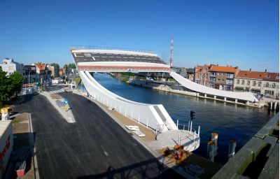 Tekst: <p>De Scheepsdalebrug is één van de belangrijkste toegangspoorten tot het centrum van de stad Brugge. Tot voor kort stond hier een draaibrug van het vierendeeltype. Die voldeed niet meer aan de huidige verkeerseisen en werd dan ook in 2009 gesloopt.<br>