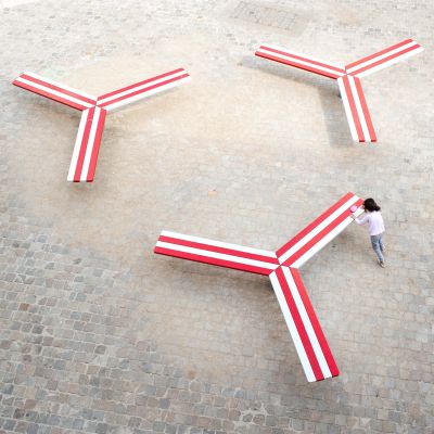 Tekst: <p>La Commune d’Anderlecht a organisé un concours pour l’installation de mobilier urbain. Lauréat, Yspilon se compose de 3 bancs en étoile à 3 branches. Evoquant les tourniquets des plaines de jeux, ces bancs sont mobiles sur leur axe. La structure des bancs est réalisée en acier thermolaqué, tandis que l’assise proprement dite est réalisée en bois. Cette structure se compose de deux pièces. La première est le socle, composé d’une platine ancrée au sol et d’un tube supportant un roulement de type iglide du fabricant américain Igus. Ce type de roulement polymère présente deux qualités essentielles pour ce projet : il ne nécessite aucun entretien, étant autolubrifiant et insensible à la corrosion, et il présente un coefficient de friction faible tout en ne permettant pas une rotation libre (autofreinage). La seconde partie supporte l’assise en lattes de chêne. Elle est composée de 3 bras tétraédrique en tôle pliée, fixés sur un tube central chapeautant le socle.</p>