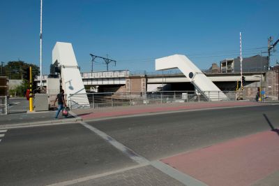 Tekst: <p>De nieuwe Sint-Annabrug over de Dender in Aalst kadert in de vernieuwing van de stationsomgeving. Het gaat om een beweegbare brug van 380 ton, waardoor de Dender bevaarbaar wordt voor schepen tot 1350 ton met een doorvaarthoogte tot 7 m. De nieuwe brug beantwoordt tevens aan de stijgende eisen inzake toenemend verkeer en veiligheid van fietsers en voetgangers.<br>