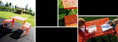 Tekst: <p>De Tètatèt-buitentafel is een vernuftige modulaire tafel. Op zichzelf biedt ze plaats aan twee personen, maar ze kan op ontelbare manieren geschakeld worden. Door het tussenvoegen van uitbreidingsstukken voor tafelblad en zitvlak kan ze omgevormd worden tot een eettafel voor acht. Ook losse bankjes zijn beschikbaar.<br>
