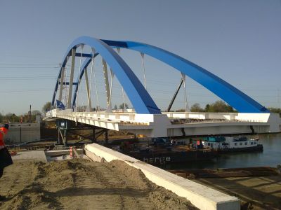 Het brugdek en de bogen werden over het water aangevoerd naar een assemblageterrein en daar volledig afgewerkt. De plaatsing van de nieuwe brug was een technisch hoogstandje en een langdurig preciesiewerk. Tijdens de invaaroperatie werd de brug in haar geheel op de nieuwe landhoofden geplaatst, waarna het betonnen wegdek kon worden afgewerkt.</p>
