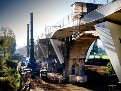 Tekst: <p>Het viaduct van Lezennes vormt de zuidelijke toegangsweg tot het nieuwe multifunctionele ‘Grand Stade’ van Lille (Frankrijk), waar de plaatselijke voetbalclub LOSC zijn wedstrijden speelt. Dit viaduct over de autoweg geeft uit op een parking voor 3.000 auto’s, is 204 m lang en over een lengte van 140 m in bovenzicht gebogen.<br>