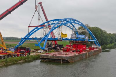 Tekst: <p>Een reeks bruggen over de Zuid-Willemsvaart, waaronder die van Beek en Tongerlo in Bree, werden gebouwd na WO2 en waren aan vervanging toe.<br> Beide bruggen werden uitgevoerd als een dubbele loopbrug. De bogen lopen onder het wegdek verder tot aan de onderzijde van de pijlers. Door de buitenste bogen te kantelen ten opzichte van de verticale binnenste bogen, onstaat een mooi lijnenspel. De pijlers staan tussen het kanaal en het jaagpad waarover de brug verder tot aan de oever uitkraagt.<br> Doordat de nieuwe bruggen hoger zijn, steeg de doorvaarthoogte tot 7 meter, wat meer mogelijkheden biedt voor het scheepvaartverkeer.<br> De bruggen werden voorgemonteerd naast het kanaal, waarna ze door twee kranen op een ponton werden gehesen. Eén van beide kranen reed dan naar de overzijde van het kanaal waar de brug opnieuw met twee kranen op haar plaats werd gehesen.</p>