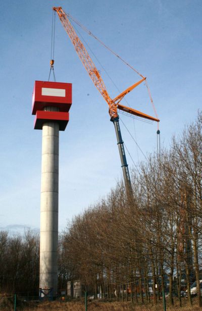 Tekst: <p>In Jabbeke werd in opdracht van de Regie der Gebouwen een radarweertoren voor het KMI gebouwd. Het project omvat de constructie van een 45 m hoge toegangstoren met daarboven een staalconstructie voor de behuizing van de meteorologische meetapparatuur. De constructie bestaat uit een stalen spiltrap in de schacht en een 50 ton wegende stalen bovenbouw er bovenop. De spiltrap bestaat uit 4 delen die één voor één met een uiterste precisie in de schacht zijn neergelaten. De bovenbouw is een vierkante box met daaronder een toegankelijk platform dat hangt aan de bovenbouw. Ten gevolge van de hoogte en de vorm moest bij het ontwerp in hoge mate rekening gehouden worden met de onderhevige wind- en ‘werveleffecten’. </p>