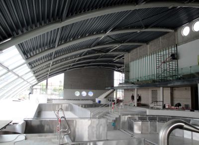 Tekst: <p>Het nieuwe zwembad van Maaseik werd tegen het bestaande sportcomplex gebouwd. Het zwembad omvat naast een peuterbad, een recreatiebad, een wedstrijdbad en een bad waar twee glijbanen in uitkomen, een cafetaria met buitenterras. Eyecatcher van het gebouw is de stalen dakstructuur die opgebouwd is uit gebogen stalen buisprofielen. <br>