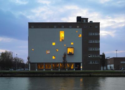 Tekst: <p>Van een bloemsilo een kantoorruimte maken was de opdracht van dit architectenbureau. Staal zou een hoofdrol spelen omwille van zijn flexibiliteit en duurzaamheid. Het werd gebruikt als steunconstructie voor de vloeren, als tijdelijke - op elk niveau te herbruiken - demontageconstructie voor uit te zagen betonwanden en montage voor de welfselvloeren. Alle nieuw aangebracht elementen werden tevens in staal uitgevoerd, zoals de trappen (opgehangen aan de hogere vloer) en de kenmerkende erker aan de kanaalzijde. Om de bureelfunctie mogelijk te maken was het noodzakelijk een groot aantal openingen in de bestaande wanden te maken zonder de stabiliteit van het gebouw in het gedrang te brengen of het verormingsgedrag nadelig te beïnvloeden. Voor de opleg van de welfsels werd gewerkt met verankerde stalen hoekprofielen.</p>
