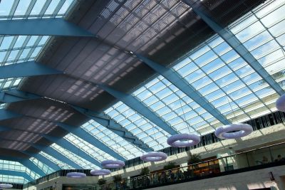 Tekst: <p>Voor het nieuwe winkelcentrum K in Kortrijk werd één van de grootste koepels van het land ontworpen. Hij is 112 m lang en 32 m breed. De constructie bestaat uit 13 spanten die de 32 m overspannen. Deze spanten hebben een hart op hart afstand van 8 m en dragen de stalen gordingen. Deze fungeren als kipsteunen voor de spanten. De spanten zelf bestaan uit plaatmateriaal die aan elkaar gelast zijn tot kokerliggers en zijn slechts 150 mm breed. De keuze voor staal was snel gemaakt, gezien het eigen gewicht, de vorm en de slankheid van de draagstructuur. Omdat het betonnen skelet van het onderliggende winkelcentrum door temperatuurschommelingen anders reageert dan de staalconstructie van de koepel, hebben de opleggingen van de stalen spanten enige bewegingsvrijheid in de langsrichting van de koepel.</p>