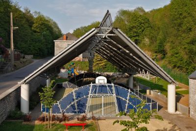 Tekst: <p>De omnisportzaal van Thon is een verbouwingsproject van een bestaande gemeentelijke infrastructuur tot een sportgelegenheid waar jong en oud elkaar kunnen ontmoeten. Er werd gekozen voor een licht skelet, rustend op de punt van zijn omgekeerde drievoeten. Het algemeen evenwicht wordt bekomen door in elk van de hoofdrichtingen twee drievoeten tegenover elkaar te plaatsen om kanteltendenzen in evenwicht te houden. De interne spanning in het skelet wordt duidelijk door de aanwezigheid van driedimensionale bogen die onderaan, de steunpunten van de grootste overspanning met elkaar verbinden. De luifelstructuur bestaat uit vier tegenover elkaar geplaatste omgekeerde drievoeten. De nokbalk die de twee portieken verbindt, is een driedimensionale ligger die de hoofdstructuur voldoende stijfheid bezorgt. Onderaan het raamwerk worden twee ronde driedimensionale bogen op de hoofdskelet geënt. Deze kapbenen moeten zorgen voor de rotatiestabiliteit van de liggers en voor een economische tussenafstand.</p>