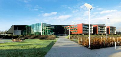 Tekst: <p>Het complex van de nieuwe campus in Brugge heeft een overkapping met een monumentaal stalen dak, dat langs de zijde van de expressweg overgaat in een gevel bekleed met antracietkleurig zink. De dakconstructie werd uitgevoerd in staal om toe te laten grote velden met een lichte constructie te overspannen. De stalen spanten - vakwerkconstructie - worden gedragen door betonkolommen die voor de nodige stabiliteit zorgen. De volledige stalen constructie heeft een lengte van 169 m, is 50 m breed, 24 m hoog en weegt 598 ton. In de grote trappenhal zijn de dakliggers en kolommen als graatliggers voorzien. Deze leggen de nadruk op de slankheid en openheid van deze campus. Dit open gevoel vinden we ook terug in de cafetaria, waar eveneens raatliggers werden gebruikt. Langs de volledige achterzijde van het gebouw is een slanke luifel voorzien.</p>