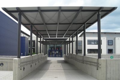 Luifel bij de ingang van de sporthal