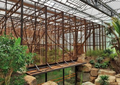 Tekst: <p>Drie metalen kooien, vijf metalen bomen, drie gemotoriseerde poorten en achter de schermen ook nog zeven betonnen kooien met rvs-traliewanden en poorten: de orang-oetangs in Planckendael kregen een kwalitatieve nieuwe verblijfplaats. Deze werd opgebouwd in een bestaande serre van 100 x 100 meter, met een hoogte van 9 meter. Een metalen ringbalk fungeert als basis voor kaders van 2 meter breed en 5 meter hoog met stalen netten, die goed zijn voor een totaalgewicht van 11 ton. De dakligger is een vakwerk, bestaande uit 100x100x5- en 60x60x3-kokers: sterk genoeg voor een overspanning van 12 meter en een slingerende aap van 150 kilo. </p> <p>Aangezien orang-oetangs de slimsten onder de apen en meesters in het ontsnappen zijn, is er een minimum aan geboute verbindingen gebruikt. Op plaatsen waar dit onvermijdelijk was, werden de moeren gelast om te voorkomen dat ze kunnen worden losgedraaid. De metalen bomen, die volledig werden uitgetekend in 3D, hebben een omtrek en een hoogte van circa 8 meter. De geautomatiseerde poorten hebben een metalen blad van 600 kilo. </p>