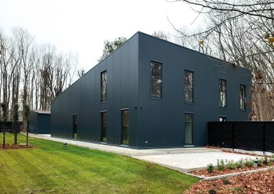 Tekst: <p>In een groene omgeving in het Belgisch-Nederlandse grensgebied maakte een vervallen woning plaats voor een moderne geïntegreerde tweewoonst. Beide huurwoningen moesten een industriële uitstraling en grote open leefruimtes hebben. </p> <p>De keuze voor een staalstructuur lag dus voor de hand, ook om de uitvoeringsfase zo kort mogelijk te houden – het volledige bouwproces, van afbraak tot en met interieurafwerking, nam slechts negen maanden in beslag! – en vanwege economische en ecologische redenen (recyclage). Zowel de wanden als het dak zijn integraal bekleed met antracietgrijze industriële sandwichpanelen. De onderkant van de dakoversteken boven de beglaasde kopgevel, die oververhitting vermijden, en de wanden die aansluiten op de terrassen zijn dan weer afgewerkt met hout. Dit zorgt voor een fraai visueel contrast. </p>