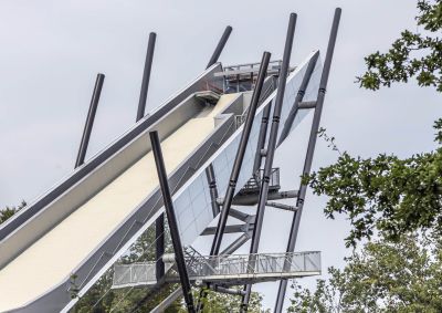 Tekst: <p>In Genk verrezen twee ‘dry slopes’: kunstmatige hellingen die de eigenschappen van sneeuw nabootsen. Om de lucht in te raken, kunnen professionele wintersporters zich lanceren via een schans met een hoogte van circa 35 meter. Deze bestaat uit twee lange vakwerken van 55 meter onder een helling van 30°, met daartussen geboute IPE400-profielen die de steeldeck met kunststof matten dragen. </p> <p>Naast het bijzondere ontwerp, met zwarte Ø508x16-buiskolommen die willekeurig in de grond lijken te zijn gestoken, valt de dry slope ook op door het slingerende bliksempad onder de schans, dat toegang biedt tot twee uitkijkplatformen op respectievelijk 25 meter en 35 meter hoogte. Om de stijfheid te verhogen en grote uitkragingen mogelijk te maken, is dit bliksempad opgebouwd uit gelaste vakwerkspanten, bestaande uit kokers die met strekmetaal zijn dichtgemaakt en zo als leuning fungeren. Dankzij een bekleding met 890 m² spiegelende aluminiumcassettes gaat de dry slope naadloos op in de bosrijke omgeving. </p>