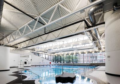 Tekst: <p>Het nieuwe zwembadcomplex in de Luikse Jonfosse-wijk is opgetrokken op een oude fabriekssite die doorheen de jaren was uitgegroeid tot een stadskanker met publieke parkeergelegenheid. Het biedt plaats aan drie zwembaden; een zwembad van 25x15 m met 6 banen, een instructiebad en een speel- en recreatielagune. </p> <p>Binnenin onderscheidt het zwembad zich onder meer via contrasterende zwarte accenten op de vloer en de muren . Wat het gebouw echter helemaal atypisch maakt, zijn het sheddak en de stalen vakwerkstructuur, die ervoor zorgen dat de aanwezigen letterlijk en figuurlijk baden in natuurlijk licht. </p> <p>Er weden meerdere versies van het staalskelet ontworpen. Uiteindelijk werd het staalskelet opgebouwd uit standaard H-profielen. De hoofdliggers, die maar liefst 36 m lang zijn, kwamen in drie stukken toe op de werf en zijn ter plaatse geassembleerd. </p>