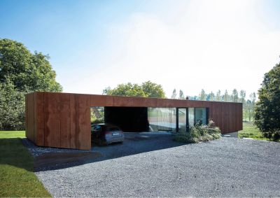 Tekst: <p>De eigenaars van dit huis in de omgeving van Hoei, die gepassioneerd zijn door architectuur, besloten beton en cortenstaal te combineren, zowel om praktische als esthetische redenen. Het dragende element van de structuur is een ter plaatse gegoten betonwand van 6 meter hoog, die in het zicht gelaten is om een brutalistische uitstraling te creëren. </p> <p>Ook de overige muren, de vloerplaat en de plafonds bestaan uit beton. Om een al te kille, industriële sfeer te vermijden, werden de gelijkvloerse gevels bekleed met cortenstaal – goed voor meer dan 138 m² in totaal. De panelen hebben verschillende breedtes en brengen ritme en reliëf in het interieur. Los van het esthetische aspect (roest en patina) is cortenstaal ook een praktische keuze, want dankzij zijn zelfbeschermende eigenschappen heeft het geen onderhoud nodig. </p>