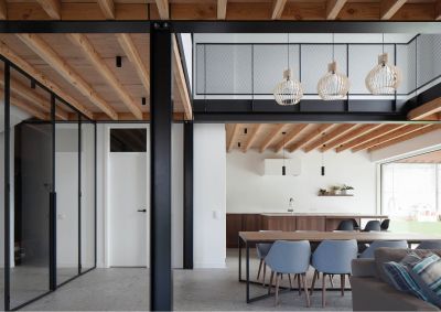 Tekst: <p>Deze nieuwbouw eengezinswoning in de Denderstreek is opgebouwd met een staalskelet, ingevuld met houten vloeren en lichte gipskartonwanden. Daaromheen is een bakstenen buitenschil aangebracht. Opmerkelijk is dat de gebruikte materialen zichtbaar bleven. De bakstenen muren van de schil en de houten balken van de invulvloeren contrasteren met de donker geschilderde organiserende staalconstructie.</p> <p>Door te werken met een open plan en een dubbelhoge vide zijn boven en beneden visueel met elkaar verbonden. Een open plan, georganiseerd door het raster van de stalen kolommen, laat een vrije invulling toe. Grote raampartijen aan de achterzijde zorgen voor een connectie met de grote tuin erachter. Het transparante geoliede hout van de plafonds contrasteert met het donker geverfde stalen skelet en de balustrades om ze weg te houden van een al te industriële connotatie. Deze balustrades bestaan uit stalen kaders die zijn opgevuld met strekmateriaal. </p>