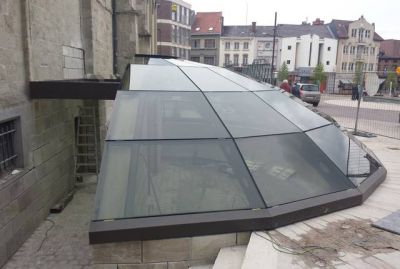 Tekst: Bij de uitbreiding van de Egmontcrypte in Zottegem werd een in het oog springende glazen koepel voorzien. Deze werd volledig opgebouwd uit stalen structuurelementen. De hoofdprofielen zijn gelaste stalen T-stukken met een variabele hoogte en een breedte van 60 mm. In de verticale vin zitten ovaalvormige uitsparingen. Tussen de hoofddragers werden stalen T-stukken T60 gebout, zodat de glasvlakken op vier zijden ondersteund worden.