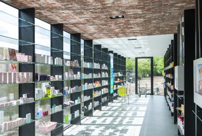 Tekst: Het uitgangspunt voor de gevel was een systeem dat tegelijk kon dienst doen als draagstructuur, raamprofiel en schapdrager. Dus werd geopteerd voor staal. De kolomafstand werd zo bepaald dat een optimale maatvoering ontstond. De kolommen staan op 1 m hartafstand. Om windverbanden te vermijden werden de kolommen als frames geïnstalleerd. Op die manier konden ze met een minimale plaatsingstolerantie worden geplaatst.