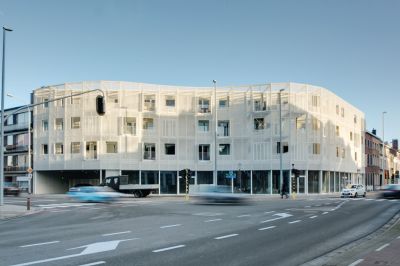 Tekst: Op de golvende rooilijn werd een tweede semi-transparante gevel in witgelakt gegalvaniseerd staal – een vlies – voorzien, waardoor op de bouwlagen een variabele tussenruimte ontstaat. Deze vliesgevel werkt ook als zonwering met luiken in strekmetaal die manueel bediend kunnen worden. De terrassen worden geschrankt en aan weerszijden voorzien van een mat doorschijnend scherm omwille van de privacy. Ook de borstweringen zijn in witgelakt staal.