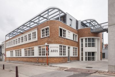 Tekst: De toepassing van de stalen structuur in dit project is tweeledig: enerzijds zorgt ze voor de ontsluiting van de appartementen door middel van buitenpasserelles, anderzijds wordt ze gebruikt om de stalen structuur van de private terrassen van de woningen te dragen en de historische gevel te stabiliseren. Ook vloeren, borstweringen en trappen zijn in stalen looproosters uitgevoerd. Verder werd ook grotendeels een metalen geprofileerde gevelbekleding toegepast.