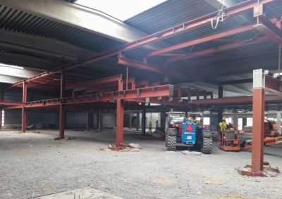 Tekst: <p>In een loods die werd aangekocht door MaSTherCell/Catalent, een farmaceutisch bedrijf dat actief is in cel- en gentherapie, werd een volledige technische verdiepingsvloer geïntegreerd op 3,2 meter hoogte – deels een roostervloer, deels een betonvloer (zwaluwstaartstaalplaat + betonvulling). Daarvoor was ook een ophangconstructie vlak onder de bestaande betonnen spanten (circa 6 meter vrije ruimte) nodig.</p> <p>Alvorens de werken aan te vatten, werd een volledig nieuwe onafhankelijke fundering voorzien, uitgevoerd door middel van gevulde stalen voerbuizen. Gezien de constructie binnen het bestaande gebouw moesten de lengte en het maximale gewicht van de stalen liggers beperkt blijven. In totaal werd maar liefst 565 ton staal voorzien voor de verdiepingsvloeren, inclusief een volledige brandwerende behandeling (meer dan 10.500 m² brandwerend schilderwerk). Op de staalconstructie zijn 2700 m² roostervloer en 1.250 m² zwaluwstaartvloeren (Cofrastra) geplaatst. </p>