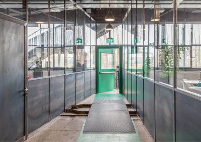 Tekst: Un espace de travail en open space a été divisé en deux sans pour autant transformer le caractère ouvert de l’ensemble et sans rendre l’espace plus sombre. Les parois réalisées délimitent les deux espaces sans les séparer acoustiquement car elles s’arrêtent à une certaine hauteur sous plafond. Composées d’une partie basse non vitrée et d’un vitrage, elles reprennent les dimensions et hauteurs des fenêtres existantes de ces anciens ateliers de l’ARBED. Tous les profils sont en acier brut non traité, la tôle de remplissage est en acier noir. L’intérieur des tôles est recouvert de feutre gris clair dans un souci d’amélioration de l’acoustique des espaces de travail. La structure métallique préfabriquée à l’atelier et le vitrage ont pu être mis en place en 3 semaines seulement, le vitrage ayant été posé sur place. En utilisant de l’acier brut non traité et en vissant les parcloses, le verre et les profils en acier peuvent être facilement séparés ultérieurement et la structure entière réutilisée.