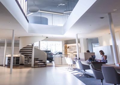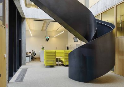 Lorsque ce bureau d’ingénieurs-conseils décide de construire son propre immeuble de bureaux, il souhaite réaliser un immeuble qui soit à son image. Un escalier en acier brut, suspendu dans le vide telle une sculpture verticale, relie les étages entre eux. Il est composé d’une structure en tubes rectangulaires et de tôles en acier. Les aciers (7500 kg) utilisés pour la construction portante sont de la nuance S235. Les volées d’escalier sont autoportantes d’étage à étage avec des points d’appui supplémentaires au niveau des paliers intermédiaires. La construction a été entièrement soudée. Les marches et paliers ont été réalisés avec une chape lissée coulée sur une isolation acoustique dans un bac formé par les tôles pliées. L’ensemble des structures de l’escalier est en acier brut, non-traité laissant apparaître les traces d’usinage et de fabrication. De même, des traces de rouille formées après le montage sur chantier restent visibles et donnent ainsi une patine unique à l’escalier.