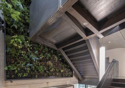 Tekst: <p>Le projet de réhabilitation lourde (démolition, reconstruction complète tout en conservant les façades) d’un îlot situé rue Madeleine à Liège comprend la création d’un patio végétalisé couvrant un parking. Ce lieu central du projet nécessite la création de connexions verticales. Un escalier hélicoïdal en acier auto-patinable ('corten') dessert 2 passerelles de connections distribuant les étages supérieurs. </p>