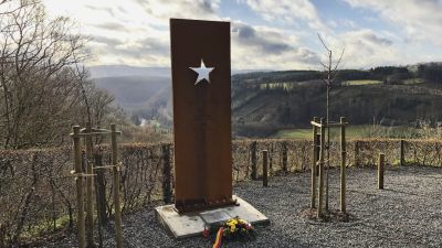 • Tekst: This monument, built to commemorate the 75th anniversary of the Ardennes Offensive in the Second World War, weighs 1.3 tonnes and stands 3 metres high and 1 metre wide. It takes the form of a memorial plate made of 50 mm Corten steel, pierced by a star-shaped perforation symbolizing the impact of a shell; this is a nod to America’s role in events. The monument is held in place by sixteen anchors cast into the concrete base. To create this memorial plaque, the 50 mm thick steel plate was treated using a burner and the hot-formed star then punched out with a 50 tonne hydraulic jack. Since the steel is a reference to the inhuman coldness of war and the use of armoured tanks, this was an operation bursting with symbolism: the impact of the shell stands for the omnipresence of violence during the struggle. The patinated surface in turn represents the ravages of time, which, to some extent, heals all wounds. Corten steel was also chosen for its durability, low maintenance and specific texture.