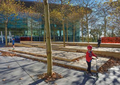 Om de gezelligheid op het ‘zuidelijke’ deel van het Europaplein te stimuleren, creëren twee waaiervormige platforms van staal en eikenhout voortaan een plek om elkaar te ontmoeten, uit te rusten en te verpozen. Ze kunnen ook worden ingezet bij de organisatie van diverse publieke activiteiten. Er is ook bijpassende verlichting ontwikkeld, die is opgehangen aan voorgespannen kabels en bevestigd aan ronde kolommen. De platforms (75 ton staal) en de zes kolommen (8,5 ton) voor de verlichtingsinstallatie zijn gemaakt van metalen profielen (S235) en vervaardigd in de werkplaats. De twee platforms zijn thermisch verzinkt, terwijl de kolommen eveneens beschilderd zijn met antracietkleurige verf. Om de staalconstructie, die bijna geen rechte hoeken bevat, te vereenvoudigen en te verenigen, werden de dragende delen uitsluitend gerealiseerd in HE160A-profielen. Het volledige platform is bekleed met planken in lokaal eikenhout.
