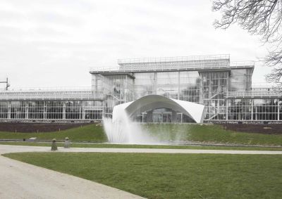 Tekst: De bestaande uitkragende betonplaat van de inkomzone werd vervangen door een sierlijk gebogen luifel van staal. De dubbelgekromde schaal rust op vier hoekpunten. Via EEM-berekening werd de vorm van de schaal verder geoptimaliseerd. De plaatdikte bedraagt 20 mm voor een staalkwaliteit S355, waardoor het totale gewicht van de luifel met een maximale hoogte van 5 m, op 24 ton komt. Om hanteerbare elementen te krijgen, werd de luifel bij de productie in 24 delen opgesplitst.