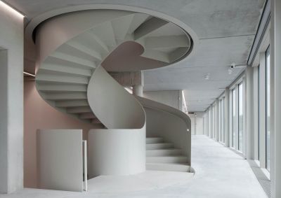 La recherche d’un design élégant a abouti à la réalisation d’une structure autoportante en acier de 7,8 tonnes. L’escalier a été préfabriqué en atelier, en sections de deux étages. Elles ont été placées via une ouverture dans le toit et fixées à des platines de raccord et des goujons, qui avaient déjà été prévus dans le gros œuvre. Les paliers ont été inclus à l’intérieur du volume de l’escalier. A ces endroits, les balustrades ont été prolongées, ce qui fait que l’interruption n’est pas visible dans le volume. Cela crée un escalier architectural imposant avec une forte présence.